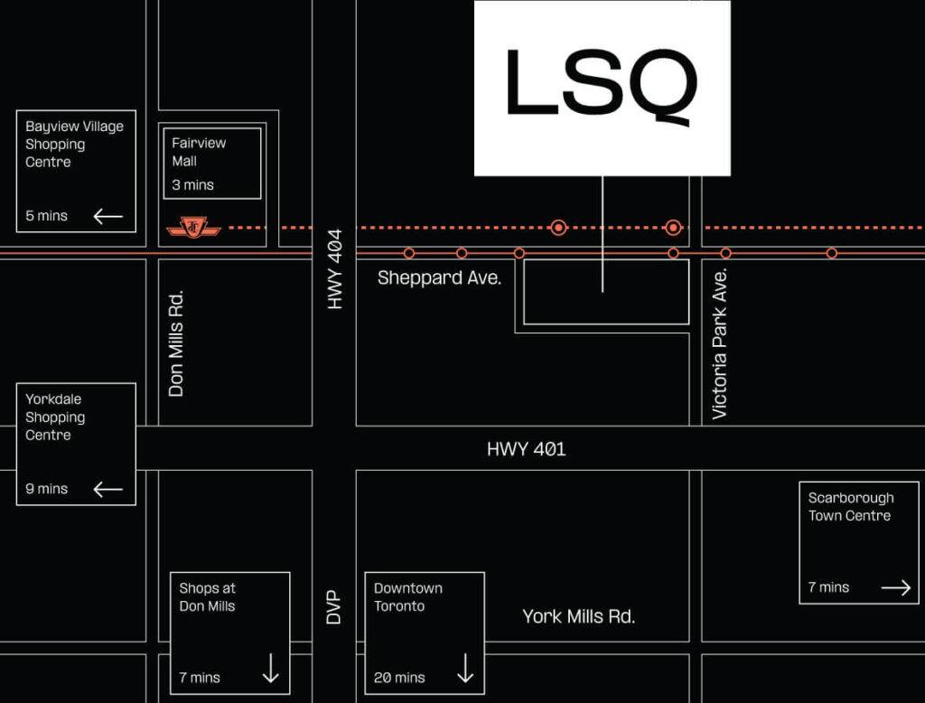 LSQ is a destination master-planned community coming to Sheppard East in North York offering residential, office and retail surrounded by 1.2 acres of green space. It’s 1.7 million square feet of more possibilities to live, work, dine and enhance your world. It’s everything you need…and more. Always more.