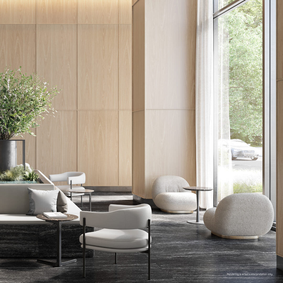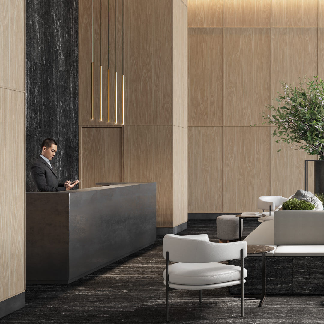 Receive a world-class welcome as you step into the grand lobby. The contemporary architecture is balanced by a soft, neutral colour palette and a touch of greenery to create a sophisticated and inviting lounge atmosphere.